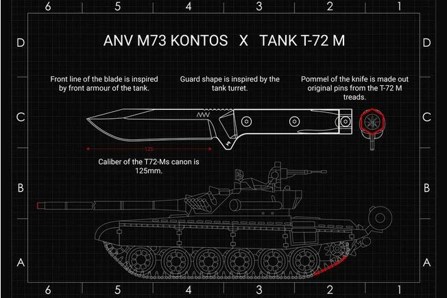 The ANV M73 Kontos is a remarkable fixed knife, designed in cooperation with the 73rd Tank Battalion of the Czech Armed Forces. The shape of the blade might remind you of the front ot the T-72Ms tank. In fact: the pommel, also called the butt cap is made from an original pin from the tracks of a T-72 tank. Very unique! In addition, the guard is shaped as such that it has the same shape as the dome of that tank. The first, numbered edition of the M73 Kontos was given to the members of the 73rd tank battalion and is not available to the public. With this version of the Kontos the M73 becomes available to all!