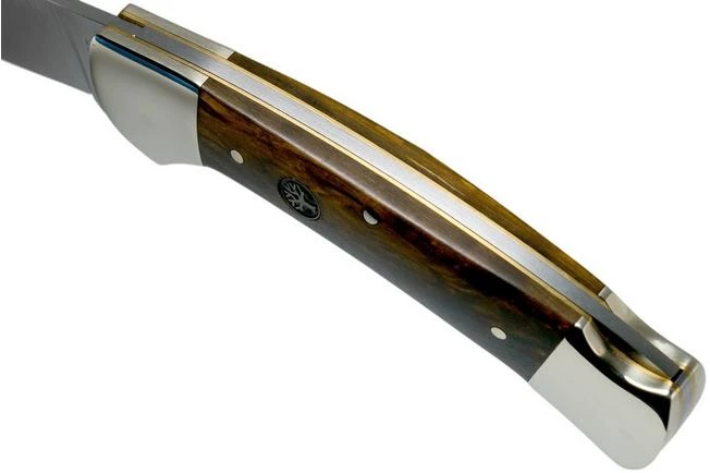 The Böker 3000 Curly Birch 117100 is a large and fancy pocket knife, made from stylish materials. This model mostly looks like a classic hunting pocket knife. The large nickel silver bolster make the knife look really old school.