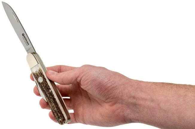 The Böker Enigma Stag horn 113031 is a versatile pocket knife with no less than two different blades. A large 9.2 cm blade, and a small 6 cm blade. Remarkable about this knife is that the large blade is locked by a backlock mechanism when opened. You unlock this blade by pressing the spine of the small blade. This will press down on a lever that is located in the backlock mechanism of the large blade, which removes the force. Now you can close the blade. Very ingenious and, at the same time, incredibly simple when you think about it. The small blade is enhanced with a slipjoint mechanism.