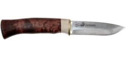 The Karesuando Hunter 10 is a typical Scandinavian hunting knife. The curly birch handle is enhanced with a coloured oil to make sure it can withstand the elements. Just in front of the crop a ring made from reindeer antlers was added for decoration. The ergonomic shape of the handle makes it comfortable to use. The Sandvik 12C27 steel blade is enhanced with a scandi grind, a typical Scandinavian way of sharpening to make sure the edge is strong and easy to sharpen. The blade and handle are separated by a nice brass bolster.