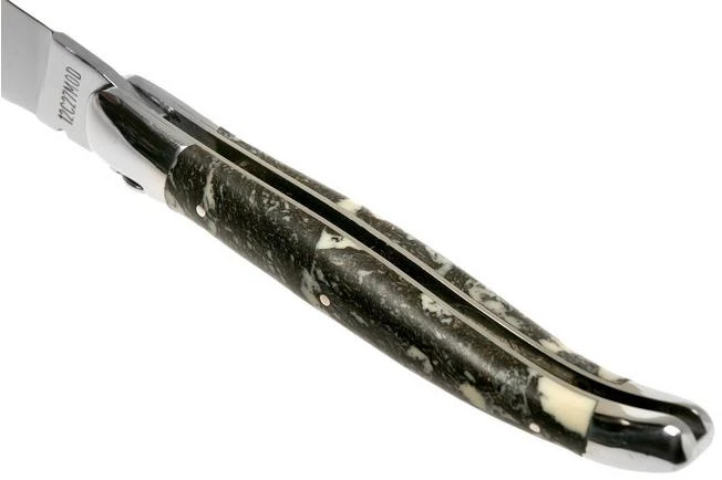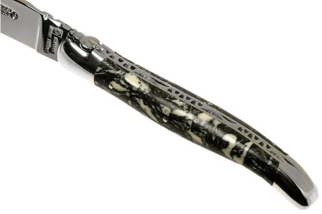 This 12 cm Laguiole en Aubrac pocket knife is the epitome of elegance. The pocket knife was modified by hand to guarantee the refined finish of stunning patterns. The spine of both the blade and the spring on the back of the handle and the liners are decorated. On top of the front bolster we can find the characteristic Laguiole bee. All of this is done by hand in the Laguiole en Aubrac workshop in the French Aubrac-region. The blade is made from stainless Sandvik 12C27MOD-steel. Both the bolsters and the blade have a slightly matted finish. As such the knife is not easily affected by dirty finger prints.