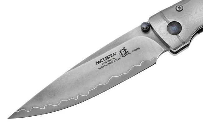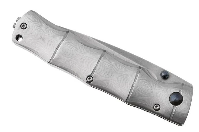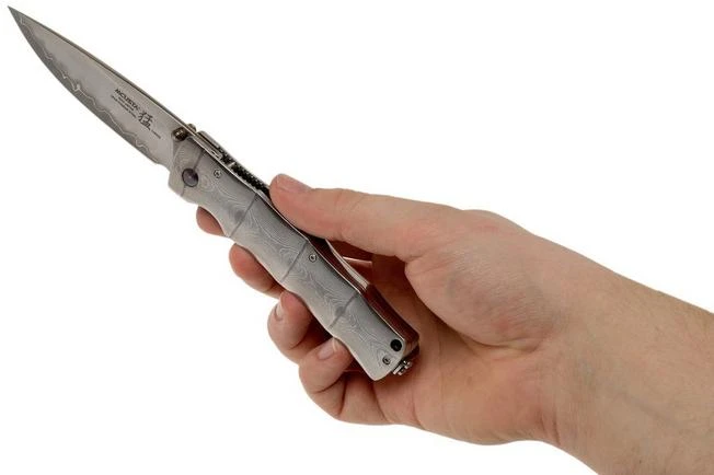 The Mcusta MC-0202G Shinra Maxima Takeri is a large and stylish Mcusta pocket knife. Perfect for anyone who prefers slightly larger gentleman’s knives. The stunning damascus steel handle stands out. It is enhanced with what Mcusta calls a bamboo pattern. This means, quite literally, that the handle is shaped like a piece of bamboo. It doesn’t only look great, it also offers enough grip.