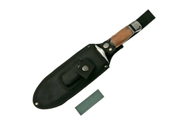 The Rough Ryder Fixed Blade is a cool fixed knife. A large hunting knife. You will immediately notice the handle when you look at this knife. Made from wood and resin, the colour combination is what makes this knife look so unique. The knife comes with a small sharpening stone and a nice nylon sheath.