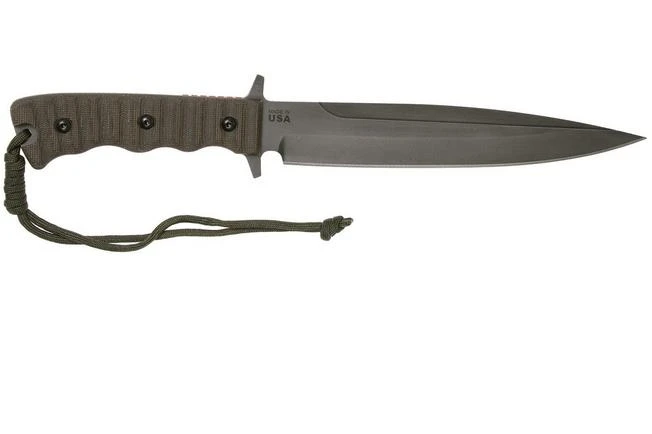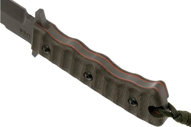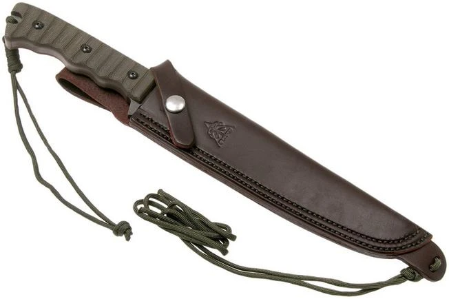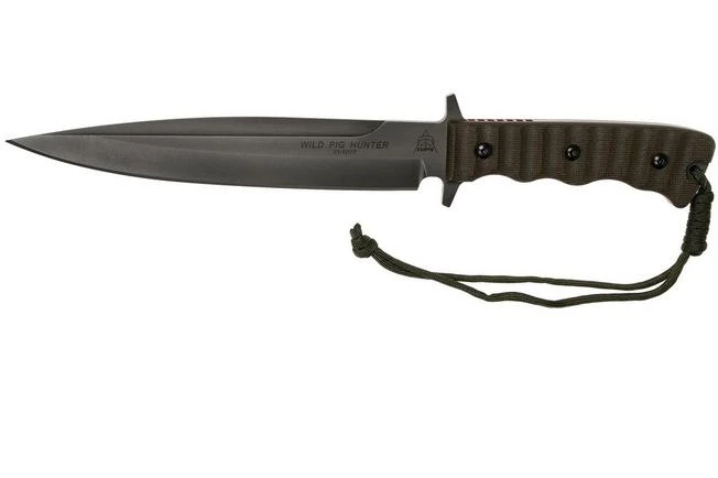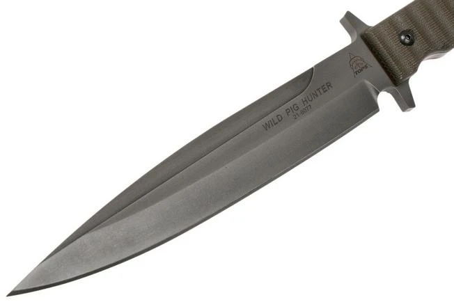 The TOPS Knives Wild Pig Hunter is a very tough-looking fixed knife, focused on hunting wild pigs. The blade shape is optimized for penetrating power. The bulges around the crop come in very handy for this, because these keep your hand sliding over to the edge of the blade. The coarse micarta parts on the handle prevent this altogether. Micarta offers a lot of grip with dry or wet hands/gloves.